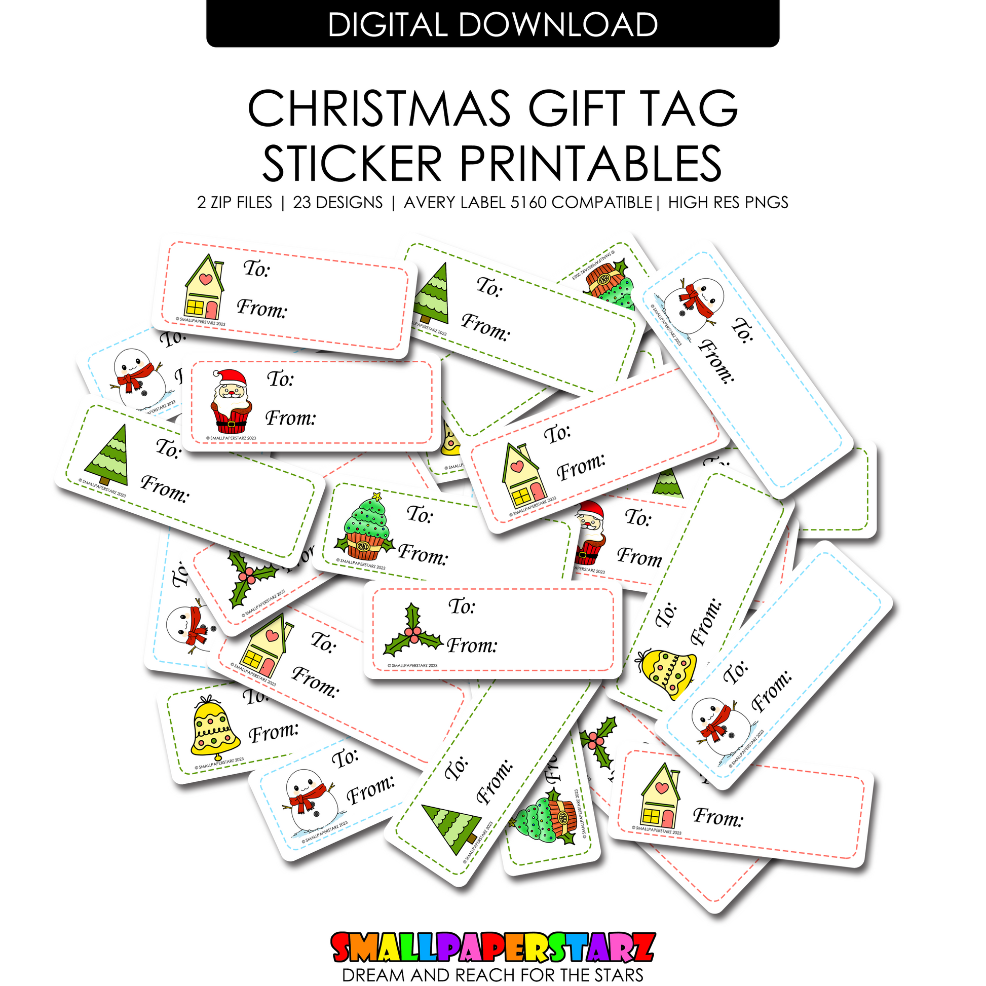 Set includes 23 individual printable gift tags that fit the Avery 5160 label sticker template. All printables are saved as pngs with 300dpi resolution.